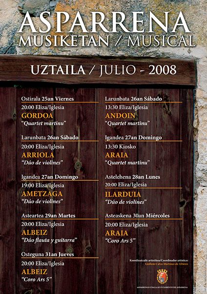 En la primera edición del ciclo de Asparrena Musiketan que se celebró en el año 2008, se dieron nueve conciertos de música de cámara en Gordoa, Albéniz, Andoin, Araia, Ilarduia, Ametzaga y Arriola. En esta primera edición del festival se hizo hincapié en la publicidad, anunciándose en diferentes medios (periódicos y radio).