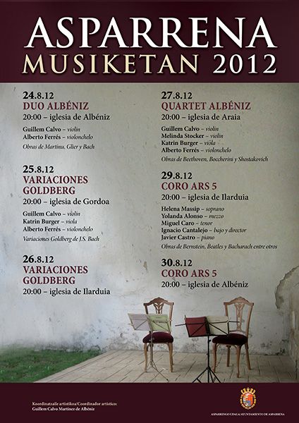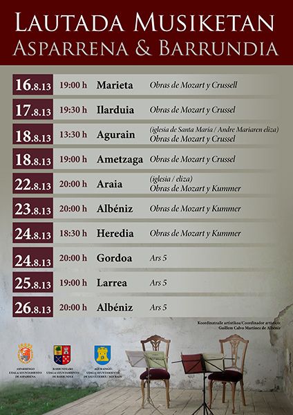 En las ediciones anteriores del festival (2010, 2011 y 2012) los conciertos se celebraron entre el 16 y el 21 de Agosto, consolidando el festival en cuanto a fechas y a grupos que actuaron se refiere: el Quartet Albéniz y el Conjunto Vocal Ars 5. Hemos tenido la oportunidad de ver cómo el público ha ido en aumento desde la primera edición del festival y consta ahora de habitantes de toda la Llanada y de muchos veraneantes procedentes de otros puntos de la península. En este ciclo se han repetido los cuatro pueblos con más interés en el festival (Araia, Albéniz, Ametzaga, Ilárduia y Gordoa), lugares que han significado punto neurálgico de recogida de muchos habitantes de los pueblos vecinos. Gracias a la colaboración de la Cuadrilla de Salvatierra, el ciclo de conciertos Asparrena Musiketan ha sido anunciado en los medios de comunicación locales.